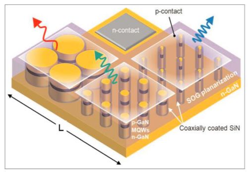 第四代小间距LED技术,则是在第三代技术上进一步实现“RGB三元色在单一LED晶体上的同步制造和集成”。这可以改变,目前LED显示行业需要分别处理RGB三原色晶体颗粒的工艺流程,实现制造工艺的高度简化。同时,第四代小间距LED产品会采用晶圆级封装(CSP)封装代替尚未普及的覆晶倒装封装技术。第四代产品主要需要在LED晶体制造阶段有新的巨大的工艺进步,并同步提升封装技术。目前,美国密歇根大学已经开发出单片集成的琥珀-绿-蓝色LED,并命名为“基于铟镓氮化物(InGaN)多量子阱的应变工程”。